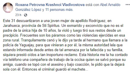 «Tranquilamente se fue a casa de su hermano, donde cenó, y más tarde le dijo que llamara a la policía de Yaguajuay, para que vinieran por él», reveló la denunciante en su post de Facebook.