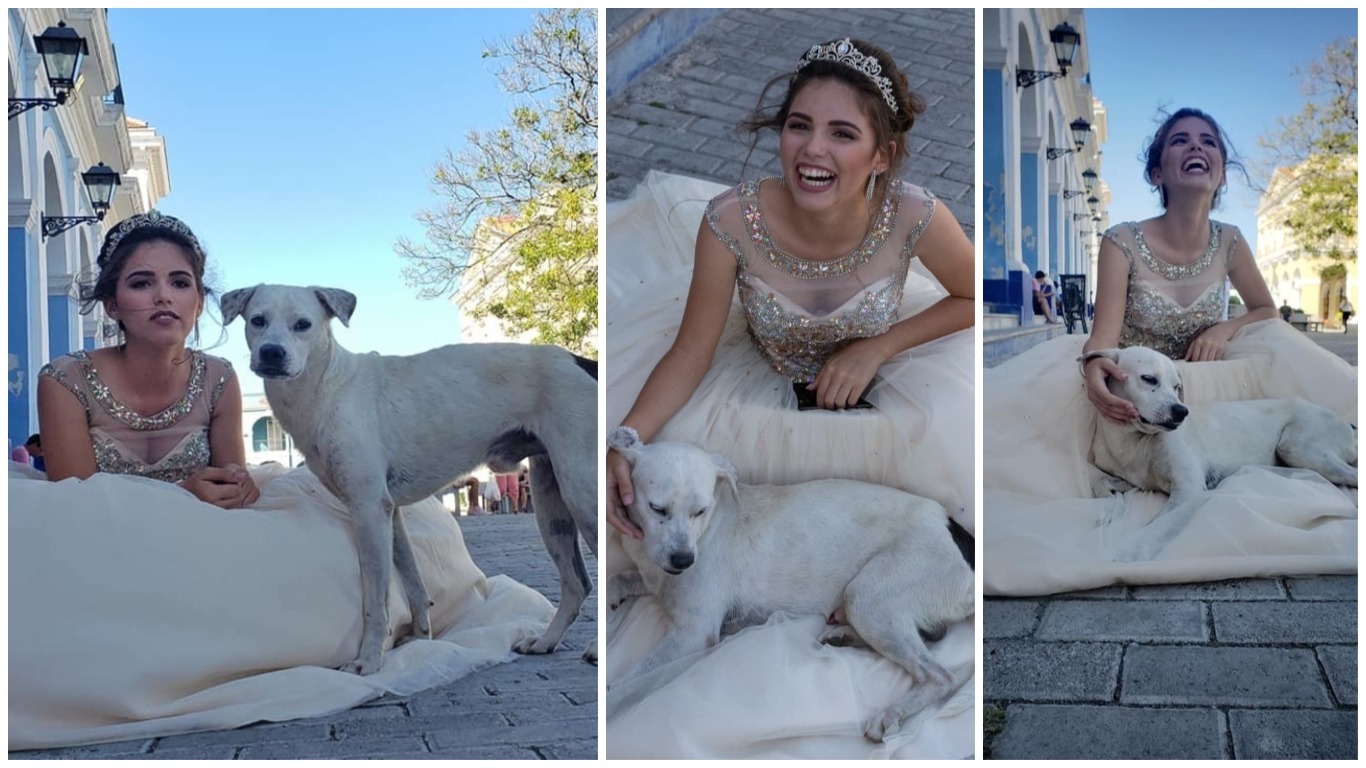 La niña se ve encantada con el perro blanco y no duda en tocarlo, acariciarlo e incluso hacerse un selfie con el animal, que se revuelca en el vestido. Ante estas tiernas imágenes, los cubanos agradecieron también el gesto de esta quinceañera y pidieron un hogar para el perro.
