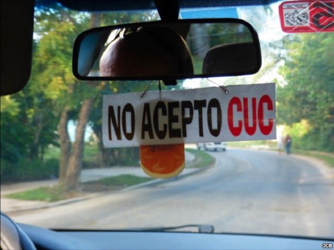 Los boteros en La Habana no quieren aceptar el CUC pues temen que una repentina ley los deje con esta moneda en sus bolsillos, así que ya muchos han tomado la decisión de poner carteles en sus parabrisas advirtiendo a los clientes que aquellos que paguen con CUC les será valorado en 20 pesos cubanos.