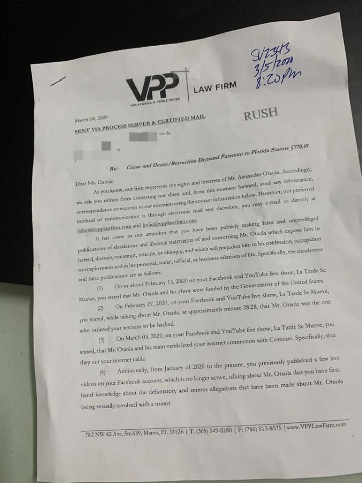 Durante una transmición en vivo a través de las redes sociales, el periodista cubano Edmundo García mostró una carta de “cese y desista” que le enviaron las abogadas del presentador Alexander Otaola, quienes le indicaron que había estado difamando a su cliente.