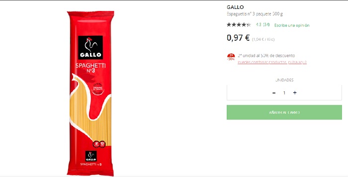 Un ejemplo más claro que el agua es el del paquete de espaguetis Gallo número 3, el cual se encuentra a la venta por 1.80 CUC, mientras que, si comparamos su precio con el de la tienda en línea de El Corte Inglés, se le puede ver en 0.97 euros. Eso sin contar que una segunda unidad del producto se encuentra en oferta al 50 por ciento.
