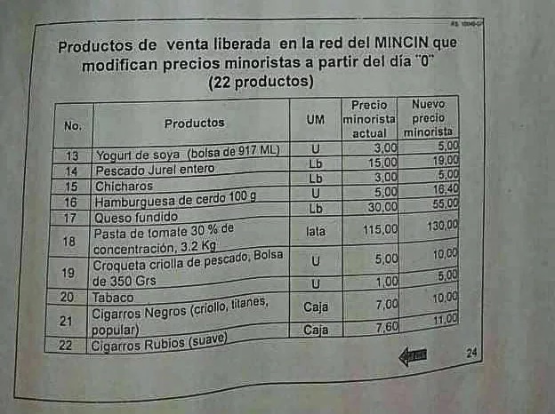 En los próximos meses podría entrar en vigor una nueva lista de precios oficiales en los mercados estatales de más de una veintena de productos, la mayor parte de ellos alimentos entre los que se encuentran los huevos, el picadillo, las hamburguesas, el pollo, las croquetas y hasta los cigarros y las botellas de ron que se adquieren en moneda nacional.