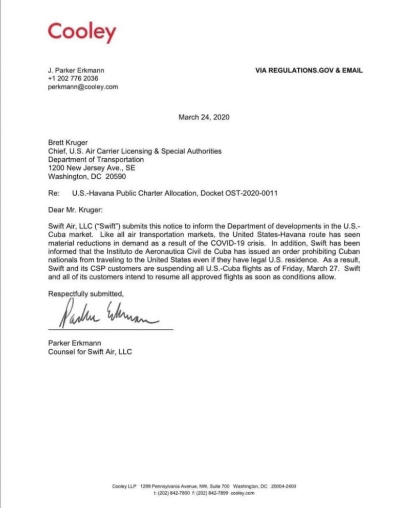 Además, Swift Air reveló que recibió un comunicado del Instituto de Aeronáutica de Cuba donde informaban la prohibición de sus vuelos por el coronavirus. Por lo tanto, decidieron suspender operaciones porque no sería posible la salida de cubanos hacia Estados Unidos, aun cuando estos tengan residencia estadounidense.