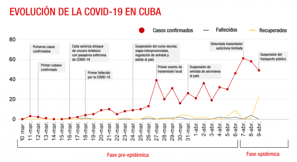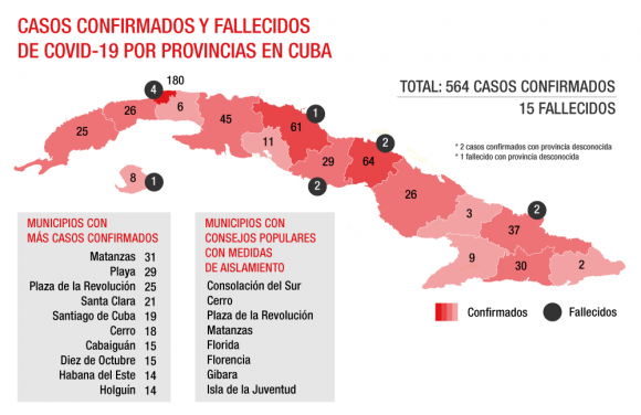 El 18 de marzo se reportó la primera muerte, uno de los tres turistas italianos que dieron positivo a la enfermedad había perdido la batalla en el Instituto de Medicina Tropical Pedro Kourí, en La Habana. Desde ese día, ya han perdido la vida otras 14 personas, la mayor parte cubanos, y el país ya reporta 564 casos positivos detectados, más cientos de pacientes sospechosos.