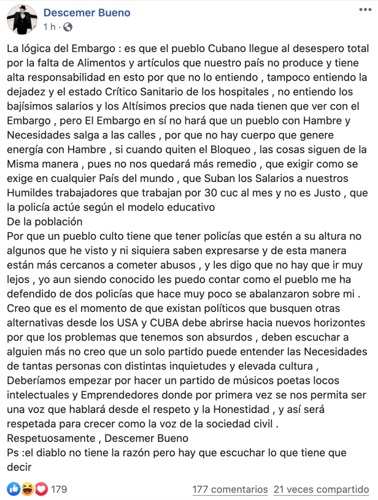 En su extenso mensaje en Facebook, el artista también critica «la dejadez y el estado crítico de algunos hospitales en la Isla». Además, comenta que si cuando quiten el bloqueo las cosas siguen iguales, a sus coterráneos no les quedará otra alternativa que exigir, como mismo se hace en otras partes del mundo, que incrementen los salarios de los trabajadores, muchos de los cuales lo hacen por unos 30 cuc al mes.