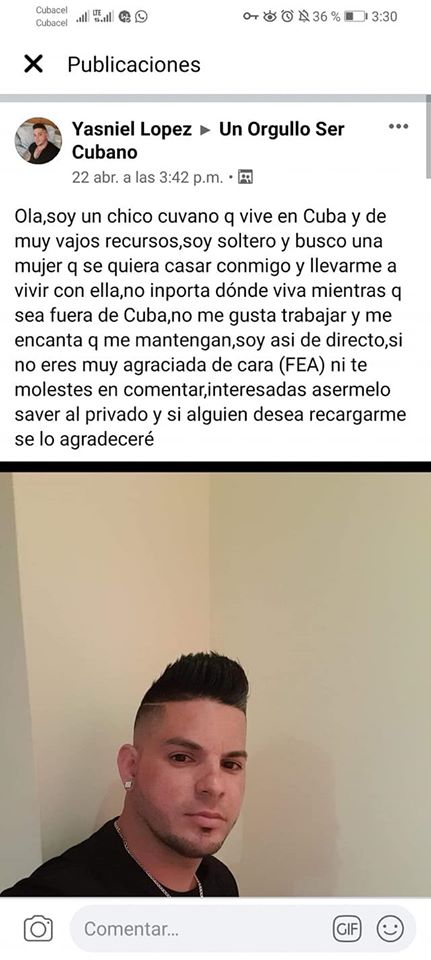 «Ola (hola) soy un chico cuvano (cubano) que vive en Cuba y de muy vajos (bajos) recursos, soy soltero y busco una mujer que quiera casar conmigo (casarse conmigo) y llevarme a vivir con ella. No inporta (importa) dónde viva mientras que sea fuera de Cuba. No me gusta trabajar y me encanta que me mantengan, soy así de directo, si no eres muy agraciada de cara (FEA) ni te molestes en comentar, interesadas asermelo (hacermelo) saver (saber) al privado y si alguien desea recargarme se lo agradeceré», escribió en su post de Facebook.