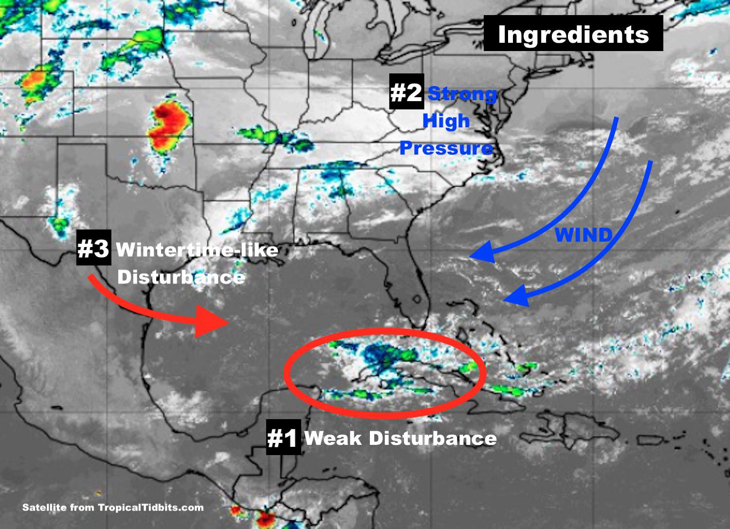 Los ingredientes para este sistema provienen sobre todo de una masa de humedad tropical relacionada con un viejo frente frío en Cuba y el estrecho de Florida.