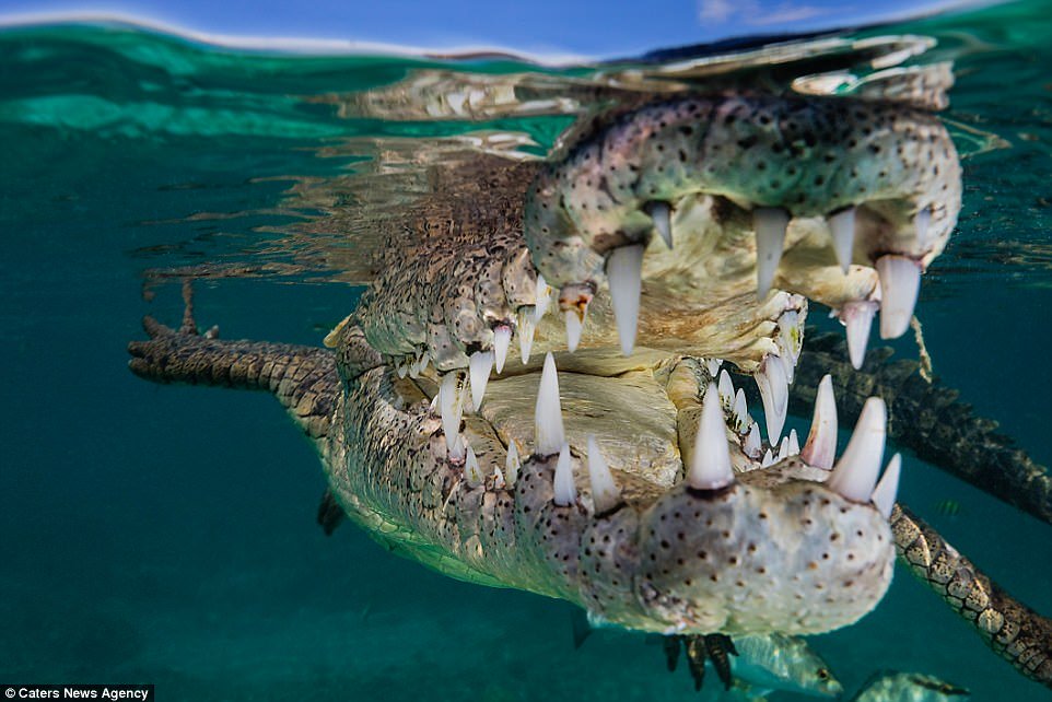 Algunas de las imágenes captadas muestran en primer plano la peligrosa fila de dientes del cocodrilo, mientras que en otras se le ve saliendo agresivamente del agua.