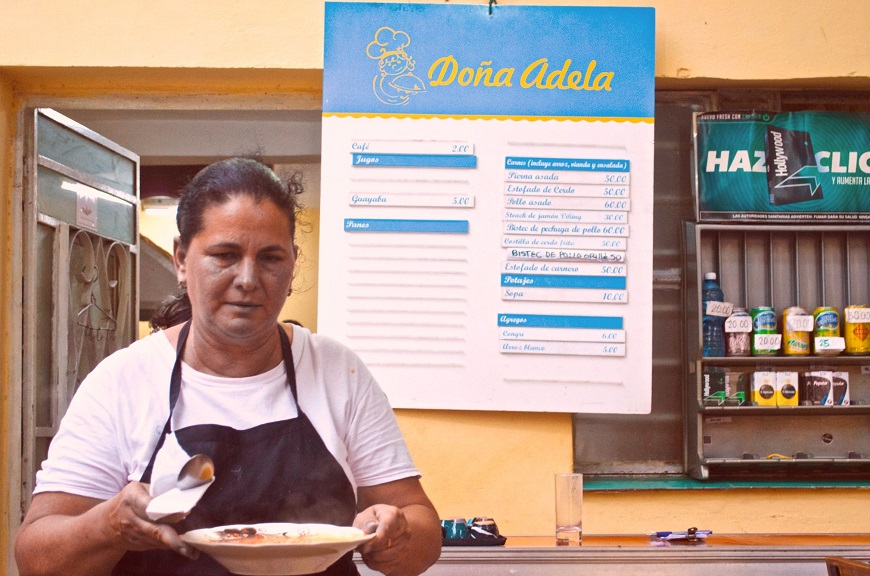 Por el alquiler de su espacio, Adela paga 2 500 pesos al mes. Trabaja con sus dos hermanas y tiene contratadas a otras cinco personas a las que paga 700 pesos al mes. Ella misma cocina, costumbre que no ha perdido desde que abrió su primer negocio en su natal Ciego de Ávila.