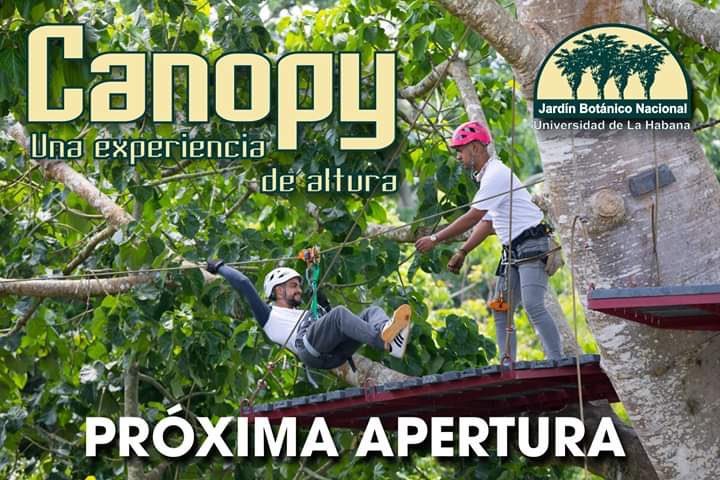 «Adrenalina pura en esta emocionante aventura en tirolesa entre majestuosos arboles y paisajes únicos en el país. Experimente la sensación de riesgo, pero con total seguridad y la asistencia de expertos canopistas botánicos», se puede leer en la imagen que acompaña un tuit publicado en la cuenta oficial del Jardín Botánico de La Habana.