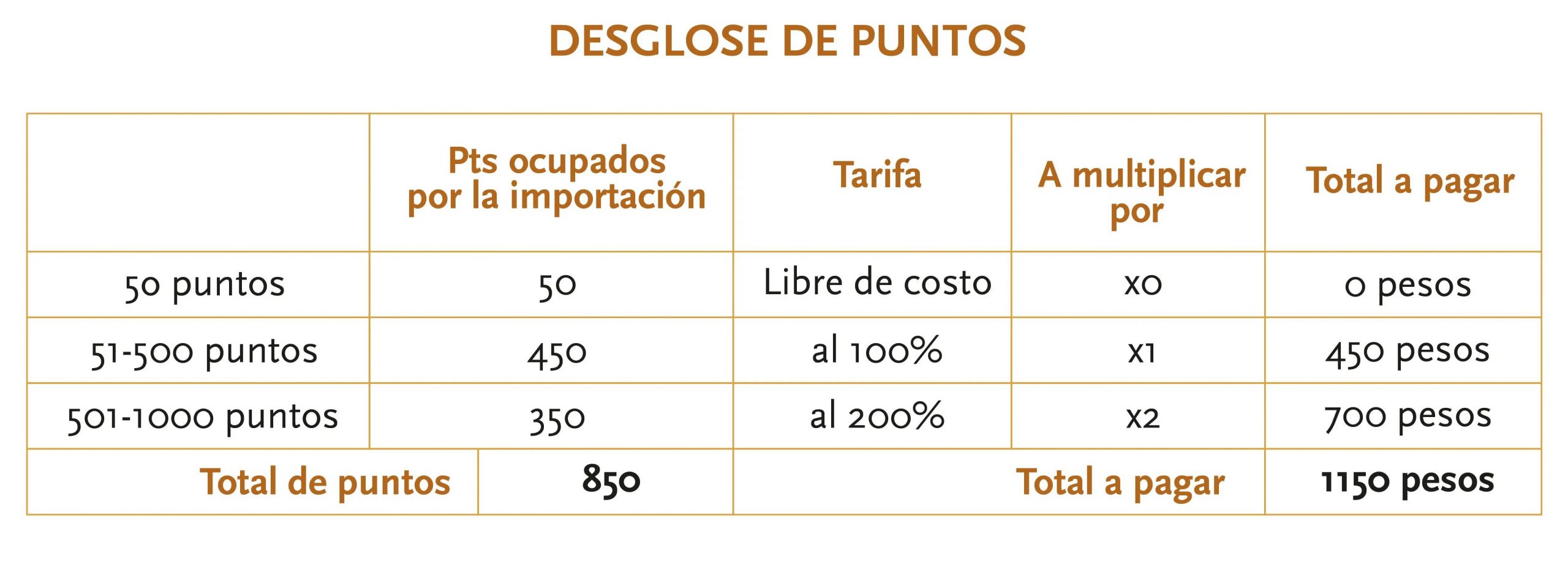 Una vez establecida la cantidad de pesos que tienes que pagar, tanto en kilogramos como en puntos, el pago de los derechos de Aduana se calcula mediante una tarifa progresiva. Como sabes, los primeros 25kg y 50 puntos (pesos) son libres de costo. Luego, de 51 a 500 pesos (entre kilogramos y puntos) la tarifa es al 100%, es decir, cada peso se considera un peso; y de 501 a 1000 pesos, la tarifa es al 200%, es decir que un peso se consideraría como dos pesos.