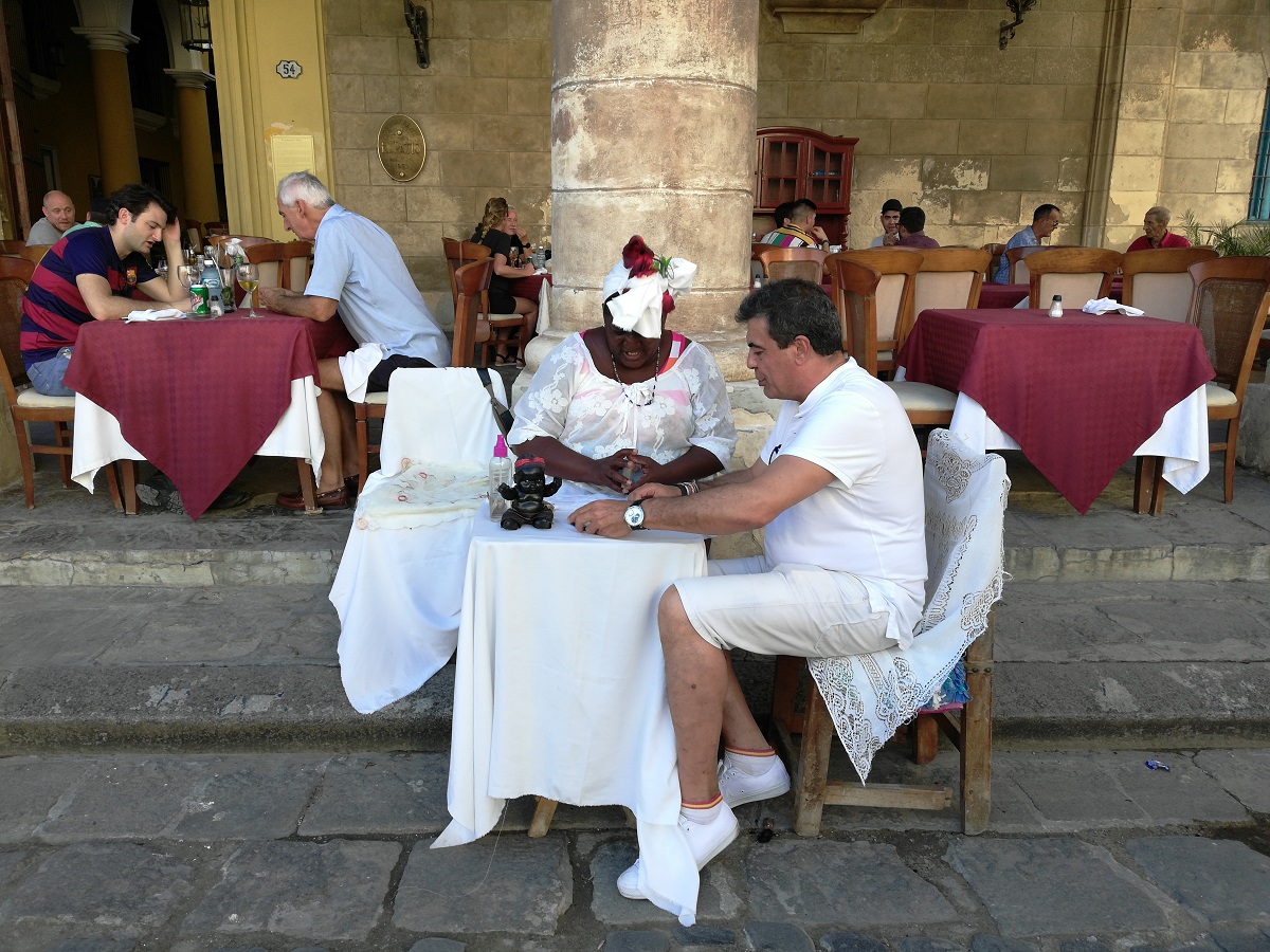 Vistiendo como una gitana, con su pañuelo de colores llamativos y una falda ancha, Luisa se sienta cada día a adivinar el futuro frente a la icónica Catedral de La Habana.