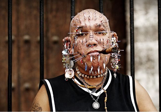«Durante mis caminatas por el Casco Histórico muestro también mis agujas, los aretes, los caracoles, los collares y otros adornos. ¡Ah…! y uso camisas llamativas, turísticas; forman parte de mi “espectáculo”. Si un mexicano amigo mío cumple su promesa de traerme veinte piercings de titanio, seguro me los pongo. ¿Que si tendré capacidad? Por supuesto, llegué a tener como trescientos en el rostro. Me gusta estar así; quiero ser admirado en el mundo entero, ser famoso».
