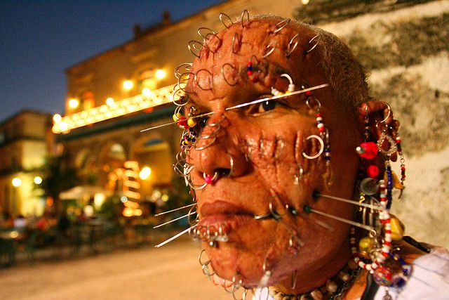 Luis Antonio Agüero logró en el 2006 el Récord Guinness por acumular un enorme número de argollas en el rostro. A pesar de faltarle una pierna, a diario recorría la calle Obispo y se paraba en los alrededores de la Catedral de La Habana para que lo miraran, le hicieran fotos o, simplemente, le diesen una «bendición».