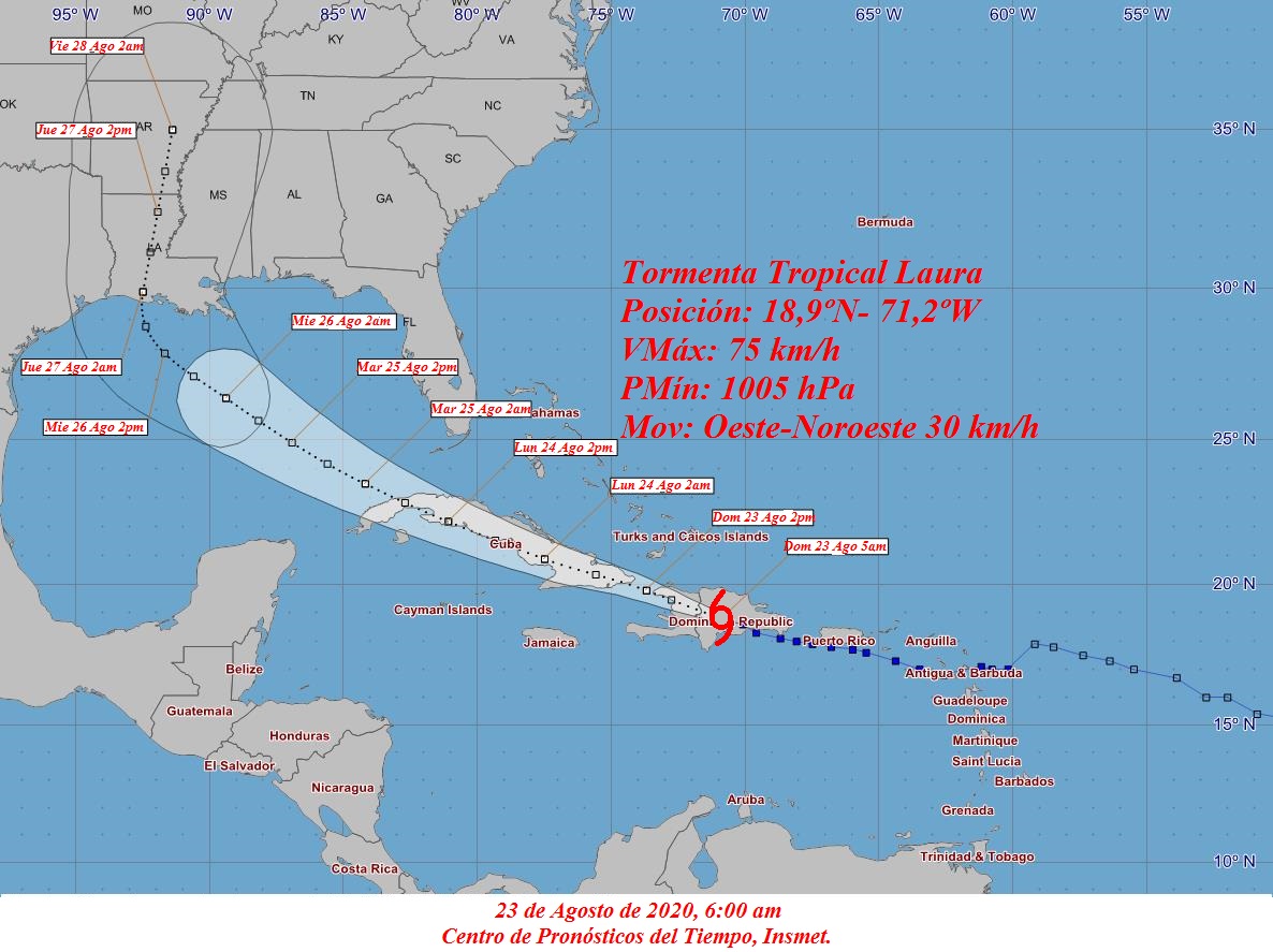 «Esta tormenta tropical Laura ha mantenido el rumbo oeste-noroeste a 30 kilómetros por hora. La fuerza de sus vientos máximos sostenidos ahora es de 75 kilómetros por hora, con rachas superiores y la presión central es de 1005 hectoPascal», detalla el aviso de ciclón tropical publicado en la prensa estatal.