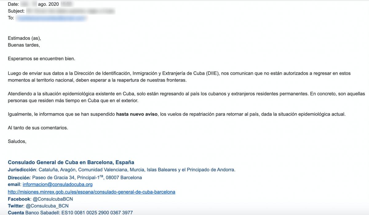 El portal de noticias CiberCuba tuvo acceso a un correo electrónico firmado por esta sede consular en la que se hace un salvedad a la decisión, aclarando que «solo están regresando al país a los cubanos y extranjeros que tienen residencia permanente», pero solo a aquellos que residen más tiempo en Cuba que en el exterior.