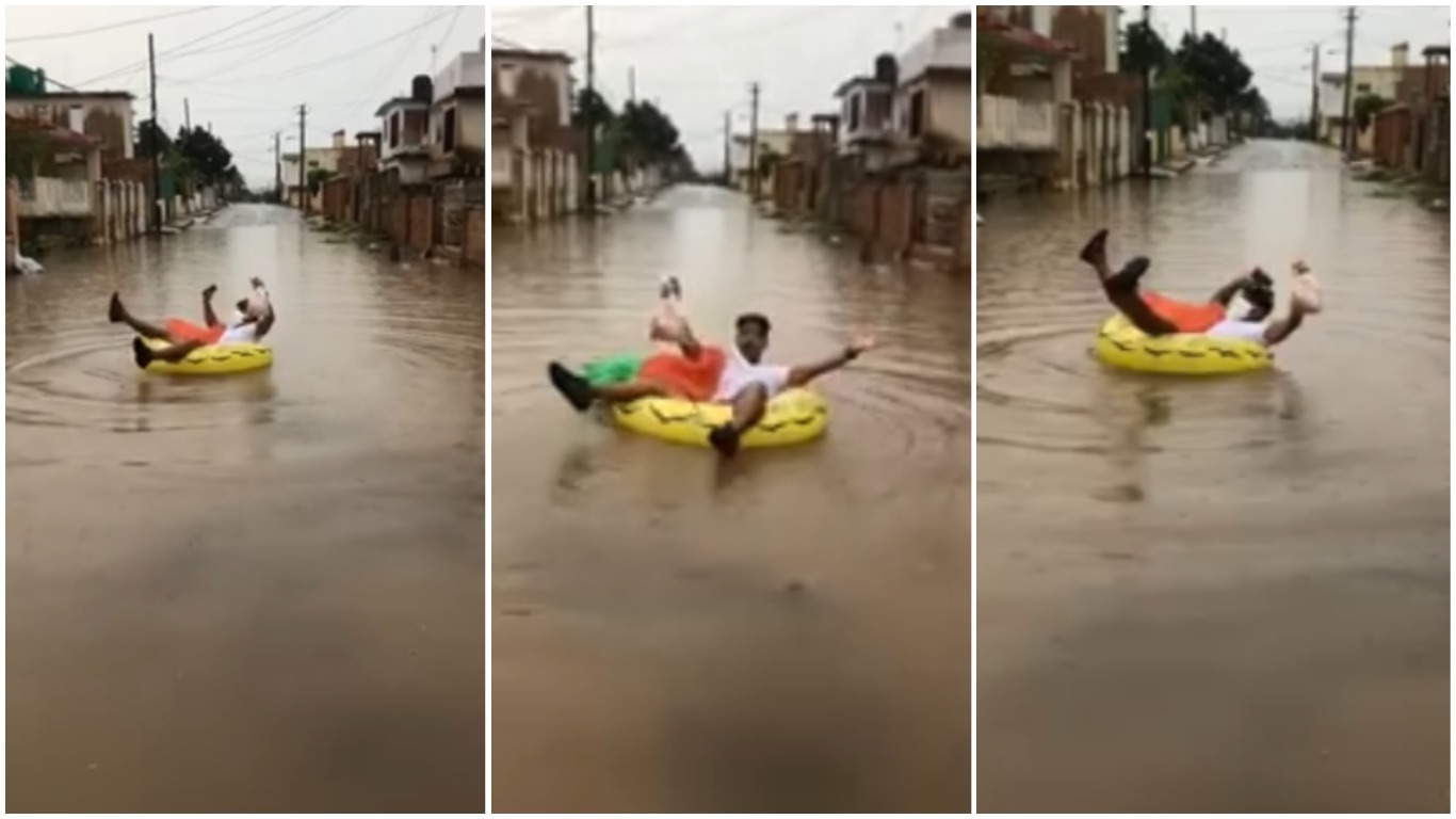 Aunque no se indica en que momento fueron grabadas estas imágenes, todo parece indicar que se trata de las recientes inundaciones dejadas por la tormenta local que afectó hace solo unos días la capital del país, por lo que el protagonista de este pequeño clip decidió sacar su balsa y poner a flote su imaginación, en medio de tanta desgracia.