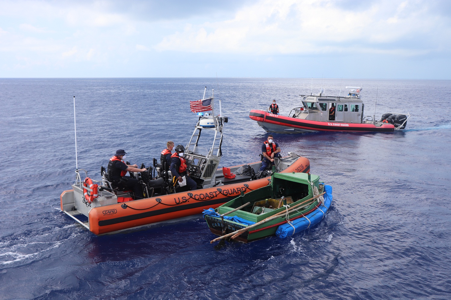 Los cubanos viajaban a bordo de un pequeño bote de color verde que fue reforzado en los laterales con una especie de flotadores amarrados a la parte externa de la embarcación.