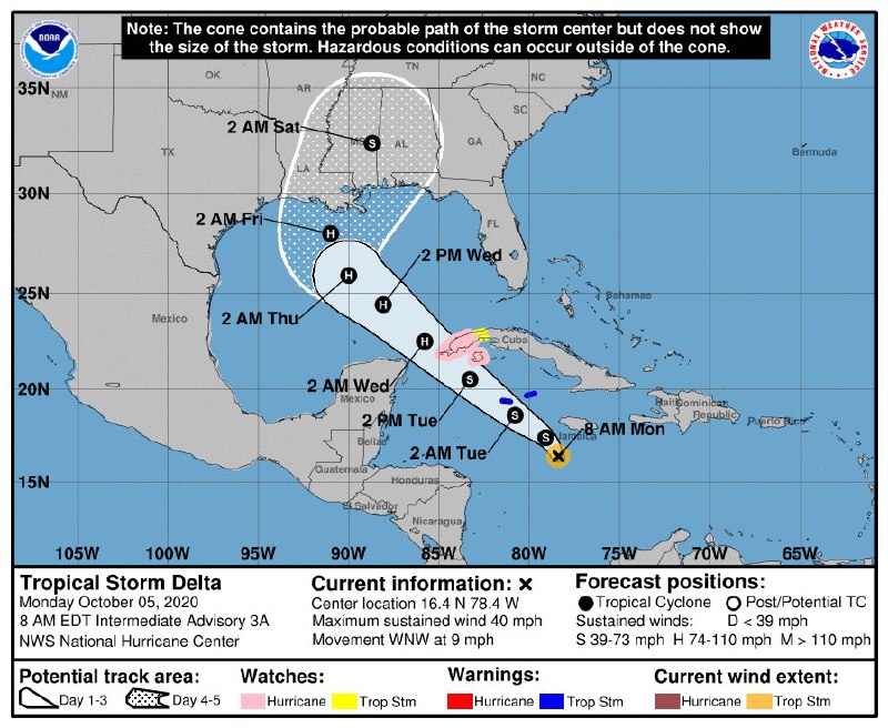 Según la predicción del NHC, Delta continuará su paso tras dejar Cuba como huracán, encaminándose hacia el Golfo de México. Su trayectoria muestra que llegaría a las costas sur de los estados de Louisiana, Mississippi y Alabama el viernes.