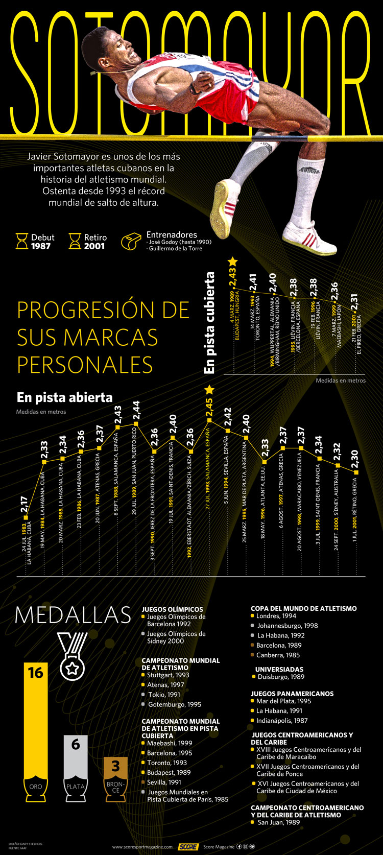 Sotomayor, nacido en Limonar (Cuba) el 13 de octubre de 1967, sigue siendo el actual plusmarquista mundial tanto en pista cubierta (2.43), como al aire libre (2.45). Entre sus logros, figura el oro olímpico en Barcelona 1992 con un salto de 2.34 metros y la plata en los Juegos de Sydney 2000.