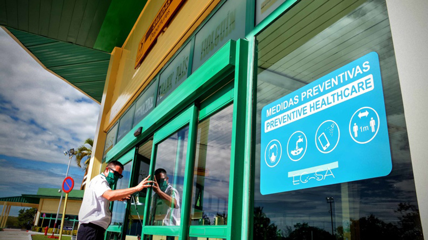 El aeropuerto de Holguín readaptó su infraestructura para cumplir con las medidas higiénicas, destacando los mostradores de chequeo con pantallas acrílicas para la protección de los trabajadores, la colocación de las señaléticas para lograr el distanciamiento físico, así como la prohibición de asientos para la ubicación de los pasajeros en cada área dentro de la terminal.