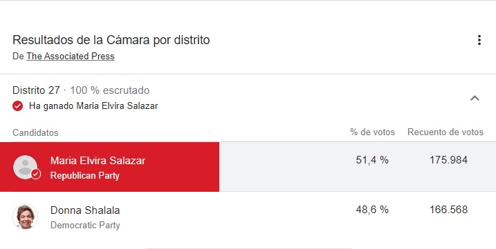 María Elvira Salazar, periodista de origen cubano e integrante del Partido Republicano, en Estados Unidos, será congresista. Con su triunfo, la colectividad de Donald Trump, presidente de ese país, recupera el distrito 27 de Florida. Su escaño lo obtuvo tras vencer en las urnas a Donna Shalala, quien ocupaba dicha curul desde 2018.
