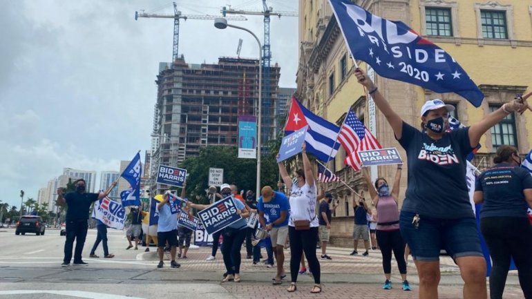 Los carteles de ‘Cubanos por Trump’ que hasta esta mañana estaban a las afueras de la emblemática Torre de la Libertad, en el centro de Miami, fueron cambiados por otros de ‘Florida con Biden’, que llevaban los cubanos que se fueron sumando junto a otros latinos a la celebración.