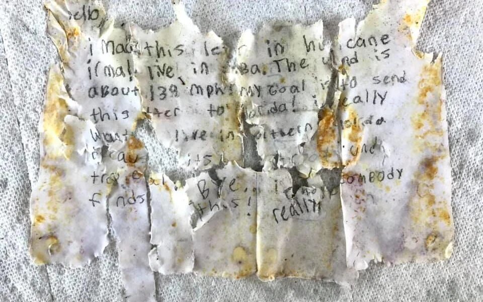 “Hola, hice esta carta en el huracán Irma. Yo vivo en Cuba. El viento es de 139 millas por hora. Mi meta es enviar esta carta a Florida. Realmente quiero vivir en el norte de Florida porque es muy genial y tropical. Adiós…”, decía el mensaje en la botella, el cual fue escrito en inglés.
