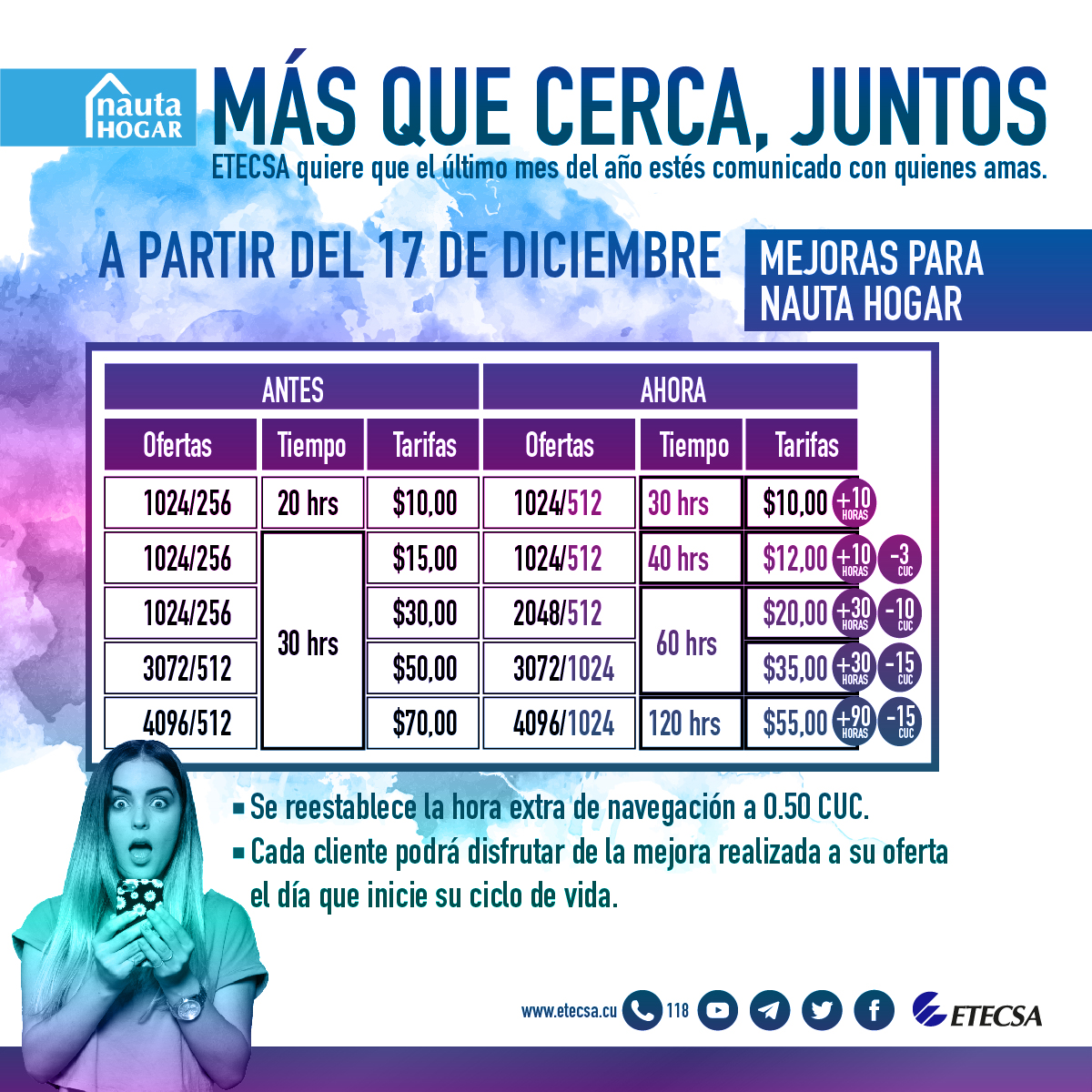ETECSA también anunció hoy que rebajará el precio a algunos de sus servicios habituales para el fin de año. Entre las ofertas más llamativas destaca la implementación de una tasa diferente para voz y datos mediante la red móvil en el horario de la madrugada (entre la 1:00 a.m. y las 6 de la mañana), así como 10 horas adicionales a las cuotas habituales de nauta hogar para cada mes.