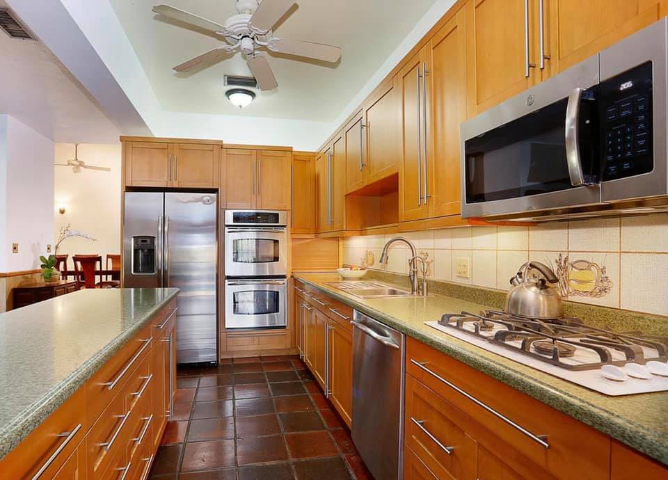 En las imágenes que comparte, se puede apreciar una cocina con mostrador de granito, que a su vez está equipada con equipos electrodomésticos (como es común en viviendas en esa nación) y armarios de fina madera.