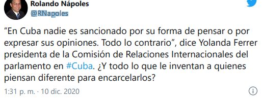 “En Cuba nadie es sancionado por su forma de pensar o por expresar sus opiniones. Todo lo contrario”, dice Yolanda Ferrer presidenta de la Comisión de Relaciones Internacionales del parlamento en #Cuba. ¿Y todo lo que le inventan a quienes piensan diferente para encarcelarlos?, señala un tuit de Rolando Nápoles al respecto.