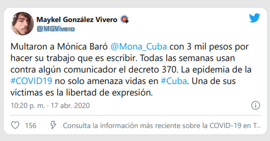 “Multaron a Mónica Baró @Mona_Cuba con 3 mil pesos por hacer su trabajo que es escribir. Todas las semanas usan contra algún comunicador el decreto 370. La epidemia de la #COVID19 no solo amenaza vidas en #Cuba. Una de sus víctimas es la libertad de expresión.”