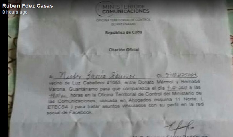 En las últimas horas ha estado circulando en las rede sociales lo sucedido a un ciudadano residente en la oriental provincia de Guantánamo, quien recibió una citación oficial para analizar asuntos vinculados a su perfil en la red social Facebook.