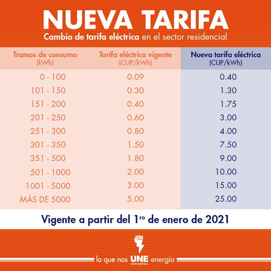 De acuerdo a los directivos de la Unión Eléctrica, un kWh le cuesta al país 3.62 pesos cubanos, pero cuando la factura sobrepasa los 250 kWh el costo se elevará a 4 CUP e irá incrementándose hasta llegar a los 25 CUP por cada kWh para los más consumidores.