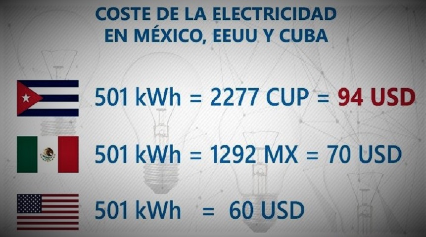 De acuerdo a los directivos de la Unión Eléctrica, un kWh le cuesta al país 3.62 pesos cubanos, pero cuando la factura sobrepasa los 250 kWh el costo se elevará a 4 CUP e irá incrementándose hasta llegar a los 25 CUP por cada kWh para los más consumidores.