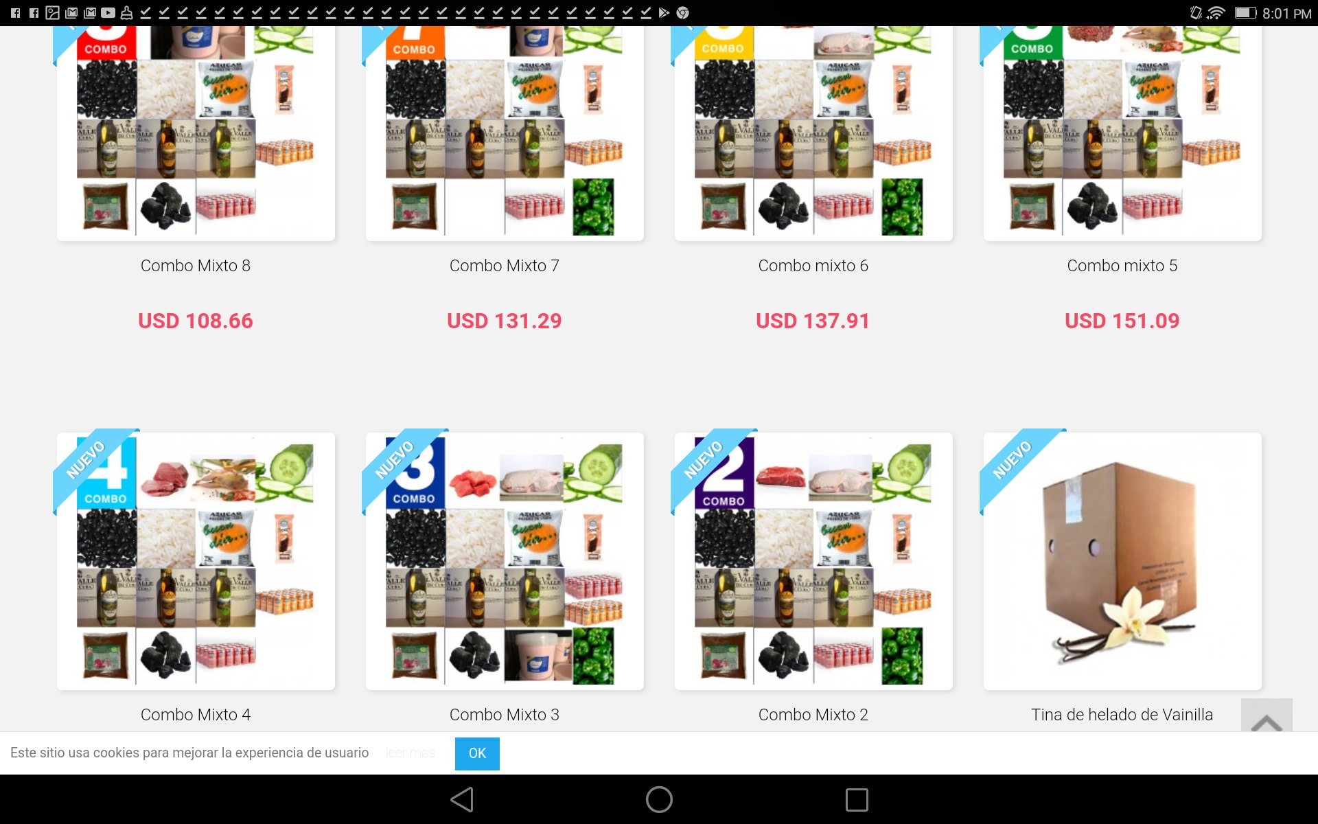 Los combos mixtos, que involucran un surtido de carnes, granos, bebidas y otros alimentos, todos de más de 100 USD, se ofertan en compañía de otros productos como cajas de refresco piñita en 14.40 USD, Ron Dorado Arecha en 28.16 USD y tinas de helado de café en 25 USD.