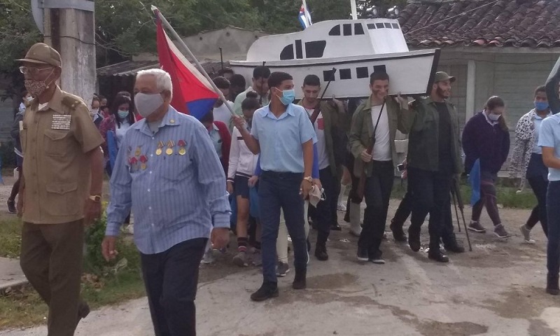 Para que el homenaje fuese aún más real, el yate fue trasladado hasta las orillas de un río de la localidad y echado al agua con seis expedicionarios encima que portaban fusiles de madera y que luego desembarcaron en una especie de ensenada.