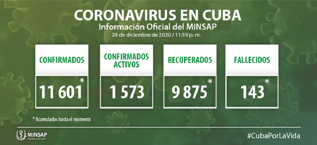 De los 11 mil 601 pacientes diagnosticados con la enfermedad, se mantienen ingresados mil 573, de ellos mil 559 con evolución clínica estable. Se reportan 143 fallecidos (ninguno del día), dos evacuados, ocho retornados a sus países, 78 altas del día, se acumulan 9 mil 875 pacientes recuperados (85,1%). Se atienden en las terapias intensivas 24 pacientes confirmados, de ellos 10 críticos y 14 graves.