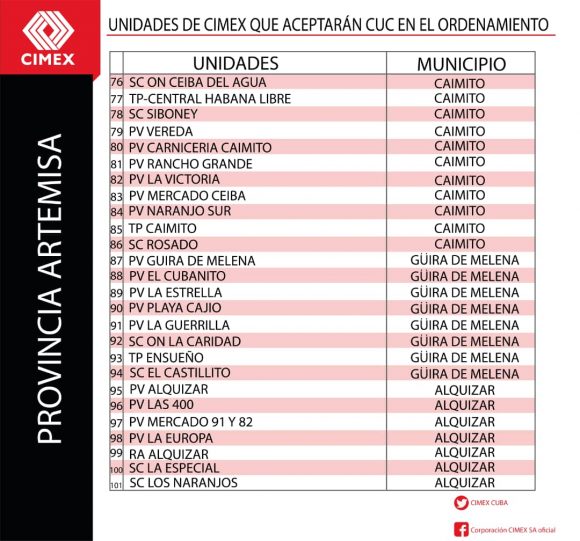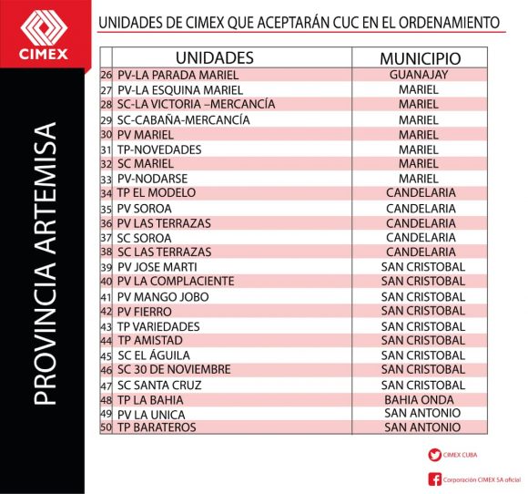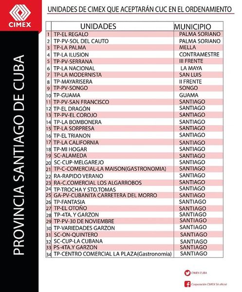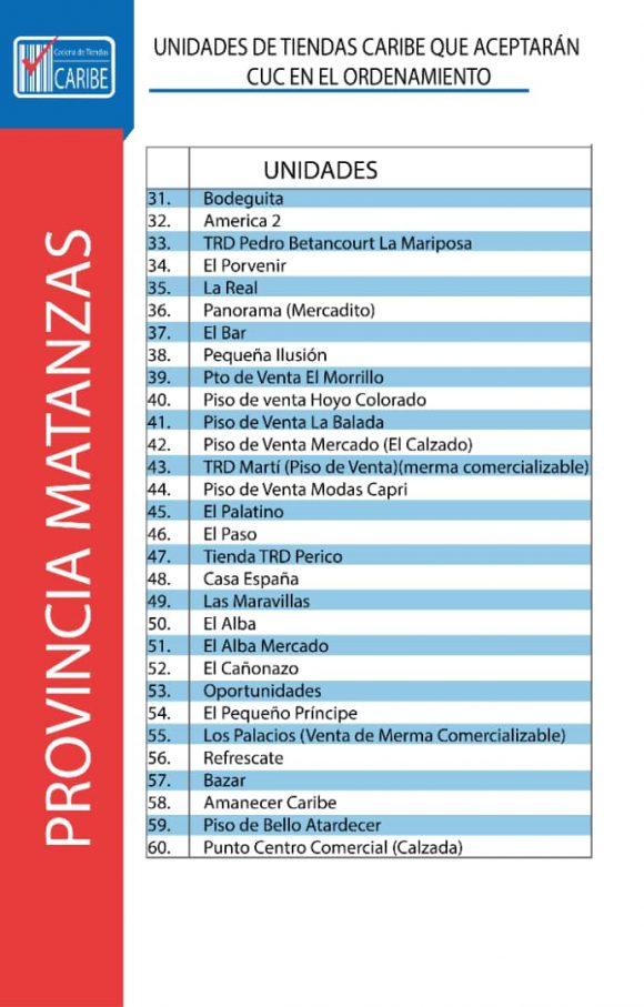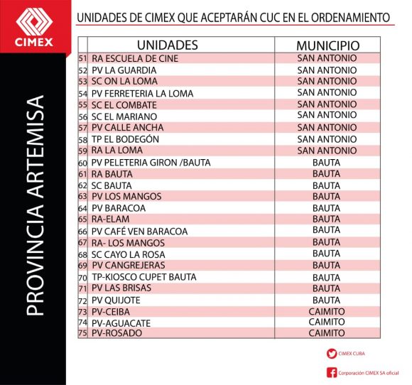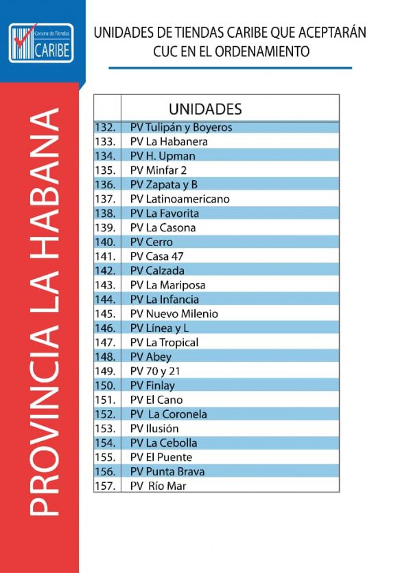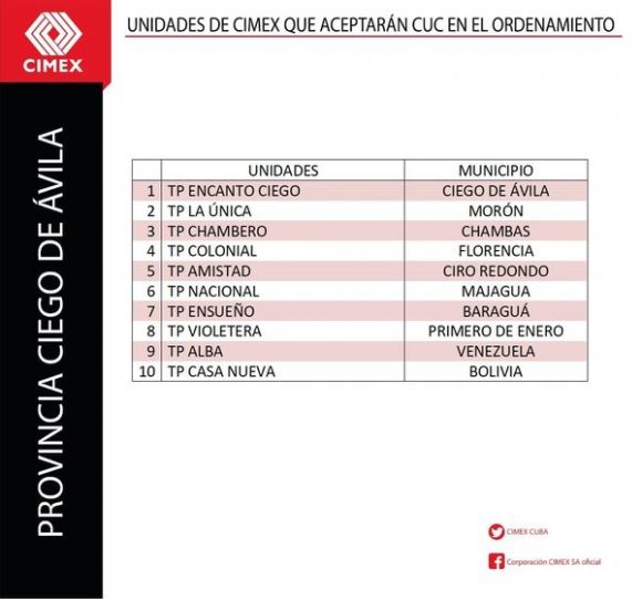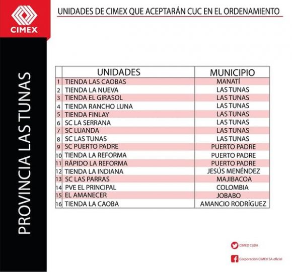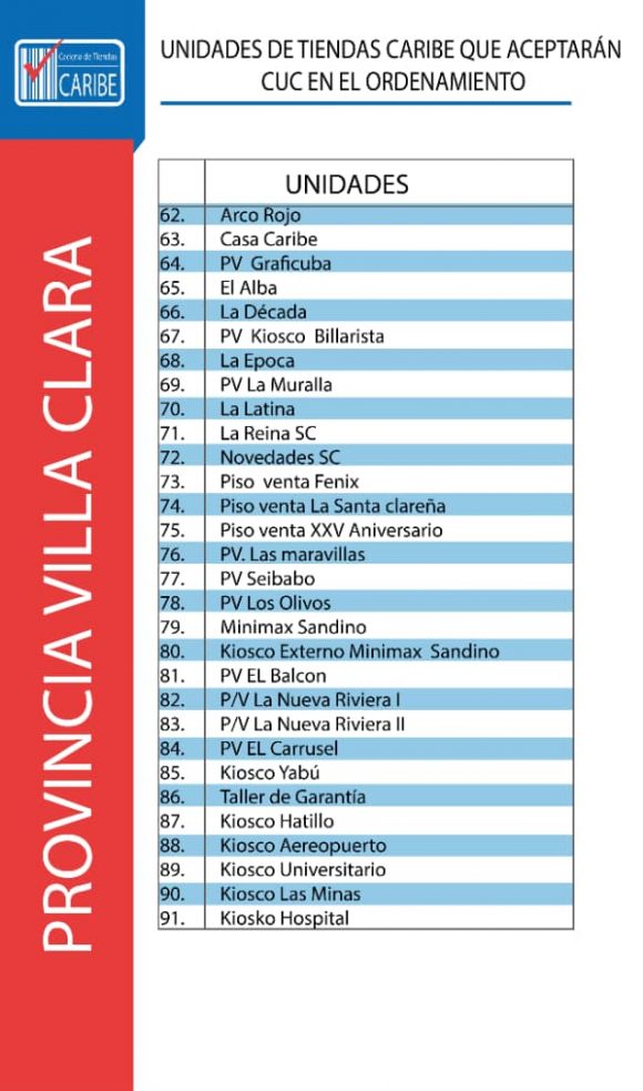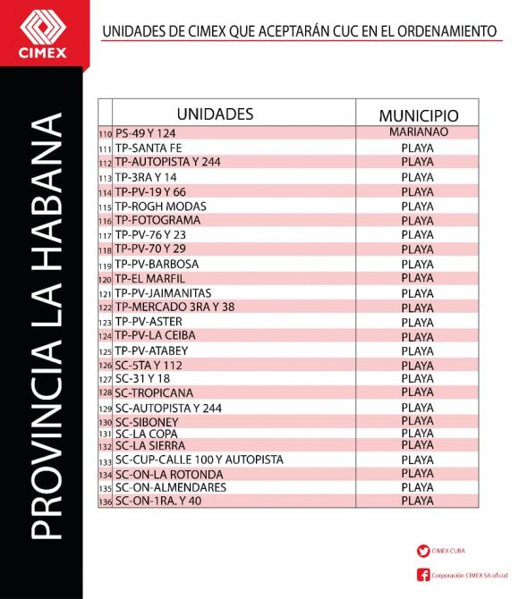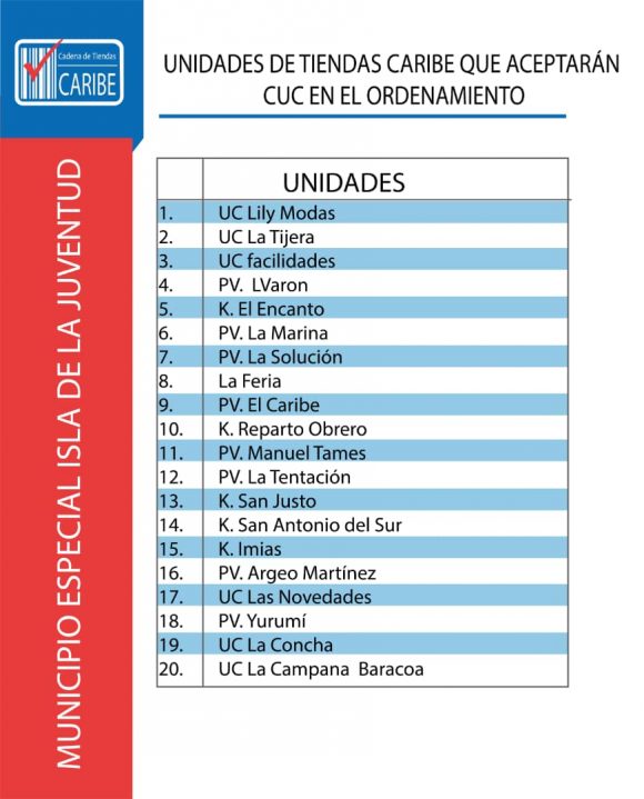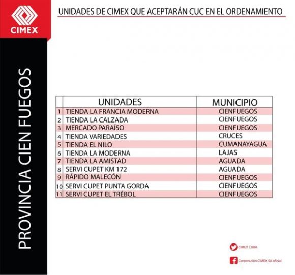 Todas las unidades comerciales de CIMEX que continuarán aceptando CUC durante los 6 meses posteriores al día cero del Ordenamiento Monetario también tendrán en su establecimiento una identificación verde que indicará al cliente lo siguiente: “En esta unidad se acepta CUC para el pago. El vuelto será en CUP”. Se trata de un total de 784 tiendas CIMEX en todo el territorio nacional