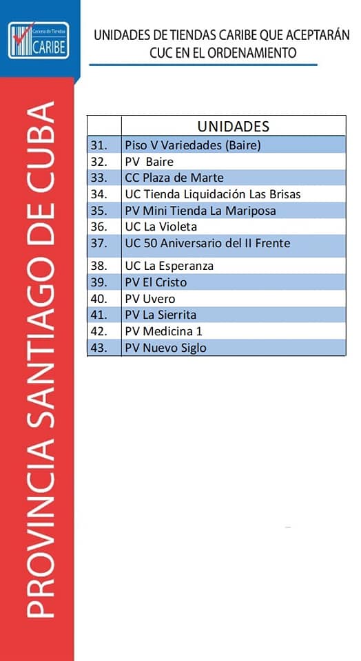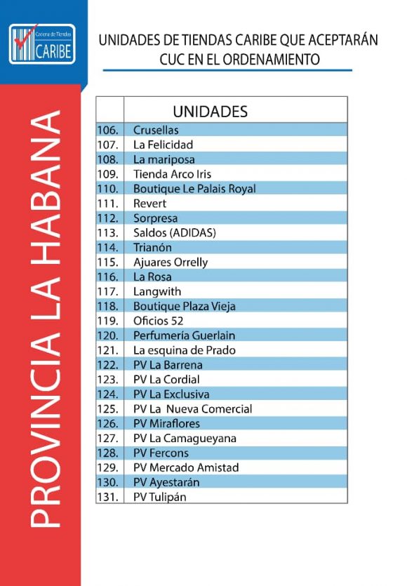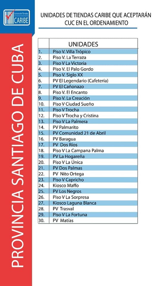 Tras las quejas recibidas por parte de la población durante los primeros días de este nuevo año, cuando muchos han intentado comprar con los CUC que le quedan en sus billeteras y no han podido hacerlo pues los establecimiento comerciales no los aceptan ya como moneda de pago, el Gobierno ha decidido publicar el listado oficial de tiendas que durante los próximos seis meses recibirán el «difunto» peso convertible en sus operaciones.