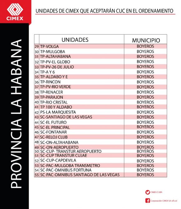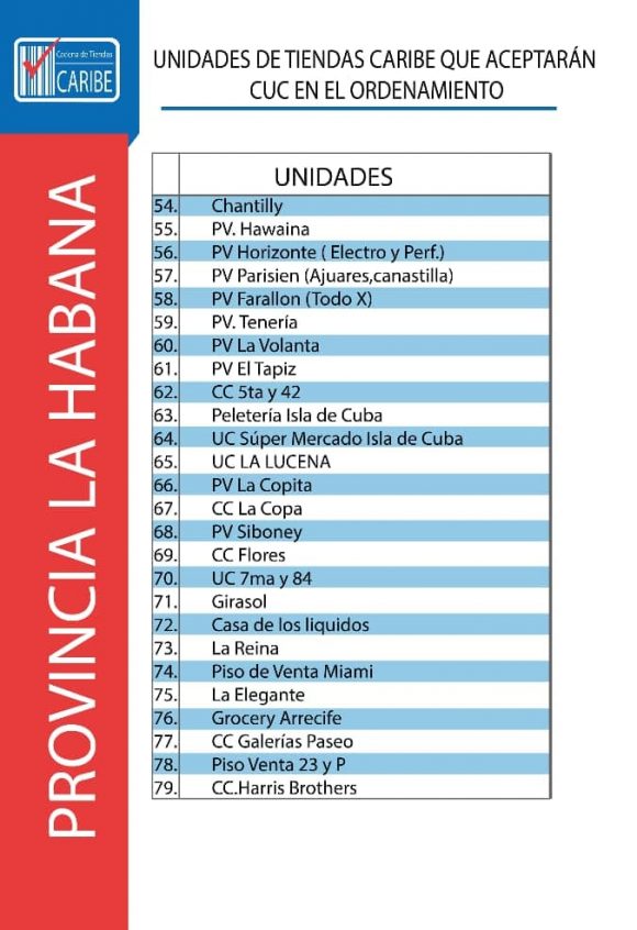 Todas las unidades comerciales de CIMEX que continuarán aceptando CUC durante los 6 meses posteriores al día cero del Ordenamiento Monetario también tendrán en su establecimiento una identificación verde que indicará al cliente lo siguiente: “En esta unidad se acepta CUC para el pago. El vuelto será en CUP”. Se trata de un total de 784 tiendas CIMEX en todo el territorio nacional
