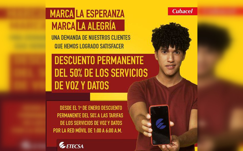 La Empresa de Telecomunicaciones de Cuba, ETECSA, ha anunciado que a partir del 1ro de enero estará ofreciendo a sus clientes un descuento permanente del 50% en los servicios de voz y datos. Además, se extiende hasta el 31 de enero de 2021 las medidas implementadas por la COVID-19.