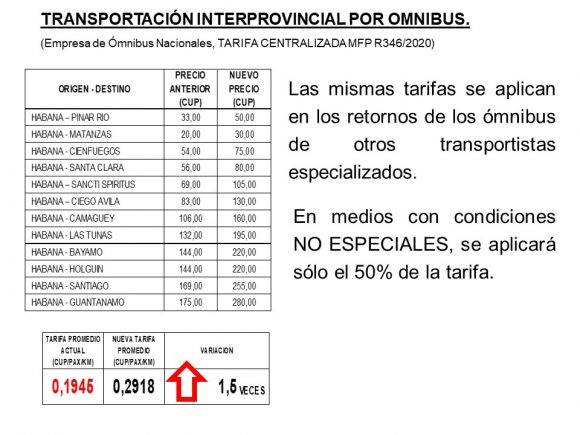 En el caso de los ómnibus que cubre rutas interprovinciales y los trenes nacionales, el incremento de precio de sus tarifas fue fijado por las autoridades en 1.5 veces, mientras que la transportación aérea por Cubana de Aviación multiplicó el costo de sus boletos por cinco, lo que ha generado una ola de criticas en la población.