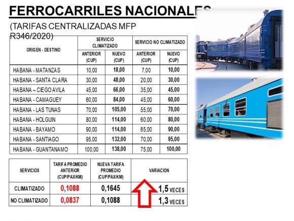 El ministro utilizó un ejemplo del trayecto Habana-Santiago de Cuba para ilustrar esta diferencia. En ómnibus, el viaje que antes costaba 169 pesos, ahora costará 265 pesos. Mientras que en tren, el mismo trayecto que antes costaba 95 pesos con “aire acondicionado”, ahora costará 132 pesos.
