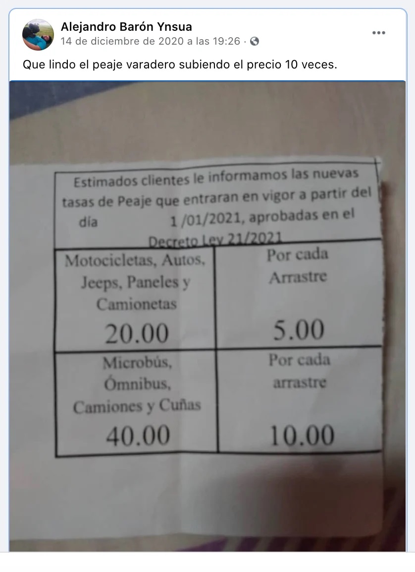 Las quejas comenzaron a salir a la luz el pasado mes de diciembre, cuando en el ticket del peaje, que por aquel entonces costaba 2 pesos cubanos, apareció una advertencia en la que se señalaba que a partir del primero día del 2021 se aumentaría la tarifa a 20 pesos para vehículos ligeros y 40 para ómnibus, camiones y transporte pesado.