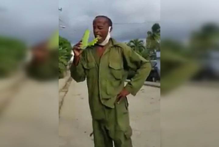 En la publicación en cuestión se puede ver a un hombre que viste un típico uniforme militar cubano y que sostiene un cactus en sus manos mientras varias personas que lo filman lo desafían a que se lo coma.