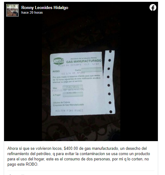 «Ronny» Leonides Hidalgo es un ciudadano cubano que publicó en sus redes sociales un comunicado de furia al comprobar que debía pagar 400 CUP de factura de gas (correspondiente al mes de enero, luego de implantada la Tarea Ordenamiento y su incremento de tarifas), cuando en su núcleo solo conviven dos personas.