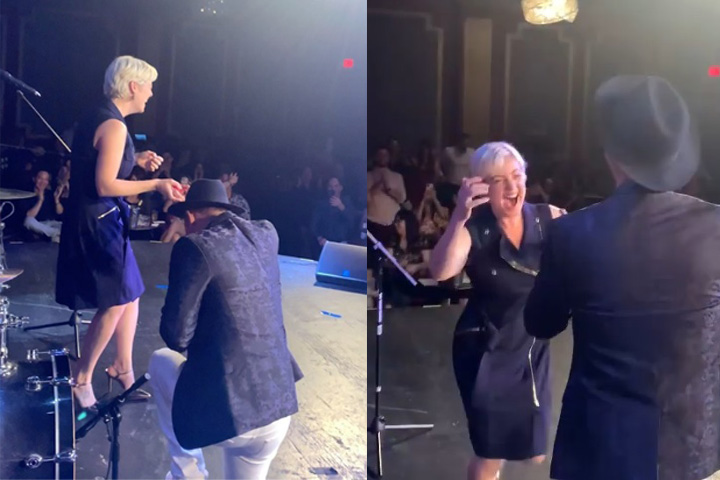 En los momentos finales de la puesta en escena, el humorista se arrodilló frente a su pareja e inmediatamente el público comenzó a aplaudir emocionado al ser testigos del momento tan hermoso que estaban presenciando.