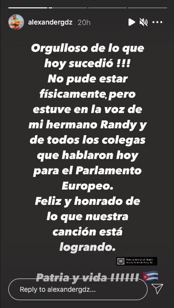 Al cabo de unas horas, Alexander compartió un post a través de sus historias de Instagram, en el que expresó su alegría por ver a sus coterráneos denunciando al Gobierno cubano ante los eurodiputados.