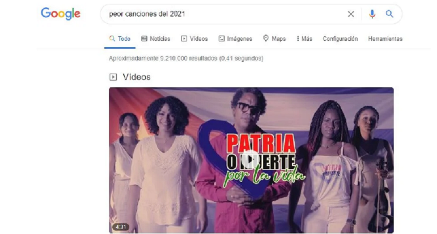 El periodista cubano Yusnaby Pérez realizó una publicación en Facebook en la que señala: «¡QUÉ PENA! Según Google, “Patria o Muerte” es la peor canción de 2021. Inténtalo y verás».